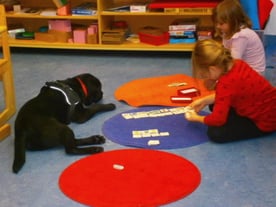 Wir, die 1a, sind eine Integrationsklasse mit 5 Integrationskindern, davon haben drei Kinder einen SPF der allgemeinen Sonderschule und zwei Kinder haben einen erhöhten Förderbedarf. Seit Schulbeginn begleitet uns ein Hund. Er heißt Lenni und ist jetzt 7 Monate alt. Momentan besucht er noch die Welpenschule. Mit 1 Jahr macht er die 1. Prüfung, um dann im Sommer für die Hundetherapieausbildung in Salzburg zugelassen zu werden.